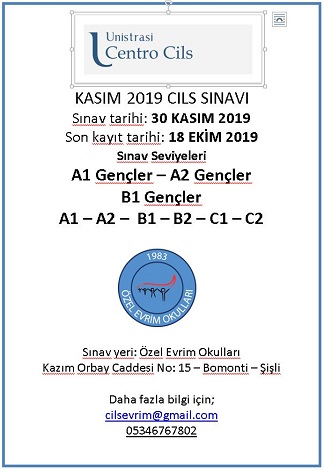 Okulumuzda 30 Kasım 2019 tarihinde CILS sınavı gerçekleştirilecektir. Sınav için son kayıt tarihi 18 Ekim 2019‘dur. Kayıt için okul sekreterliğine ulaşabilirsiniz.