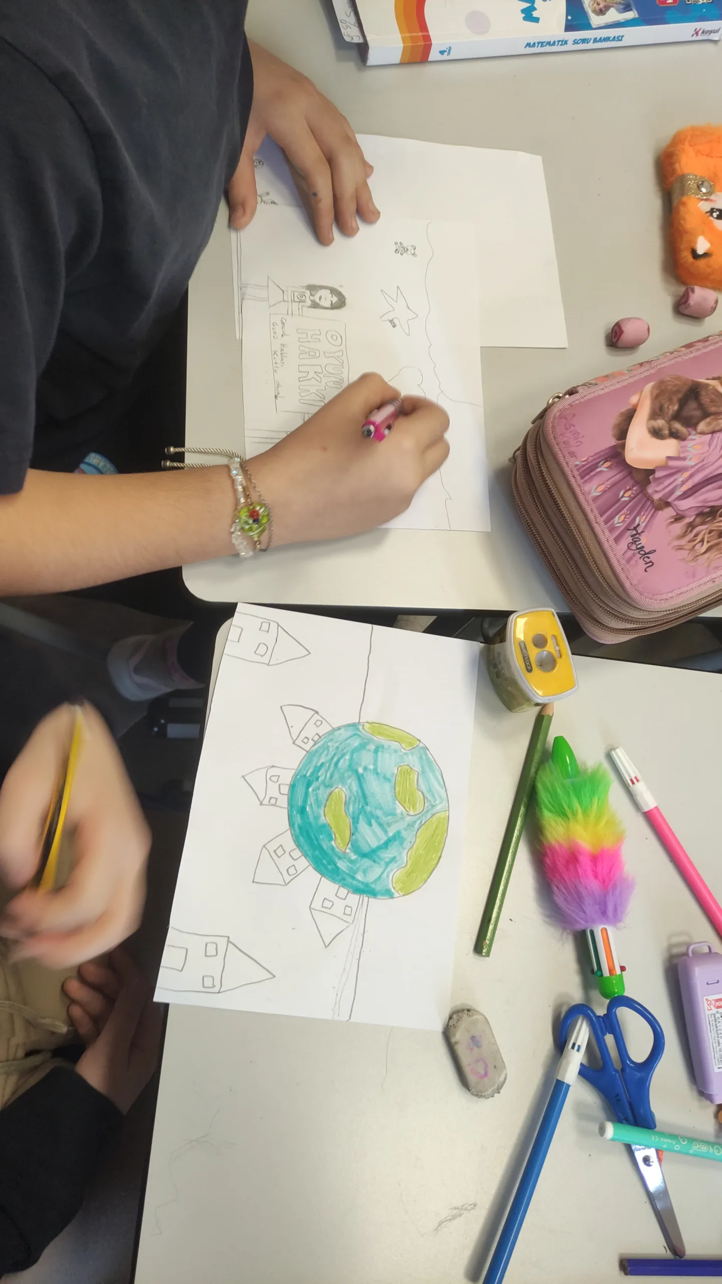 ️ Önce çocuk hakları üzerine konuştuk, videolar izleyerek farkındalığımızı arttırdık. Daha sonra, çoğu zaman çok duyulmayan çocuk haklarını eşleştirerek inceledik ve her öğrenci seçtiği hak üzerine düşünerek bu hakkı yansıtan bir resim çizdi.